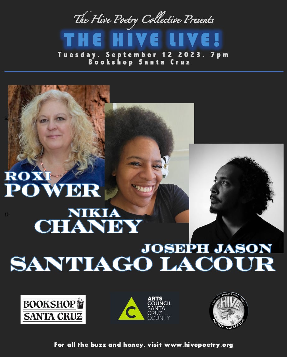 And don’t miss three fantastic local poets reading from their new work on September 12, also at 7pm at Bookshop Santa Cruz. Joseph Jason Santiago LaCour, Nikia Chaney, and Roxi Power will read at the next Hive Live! More info here.
